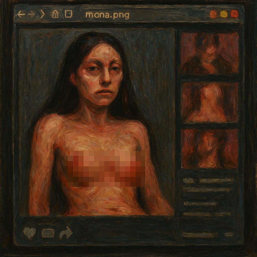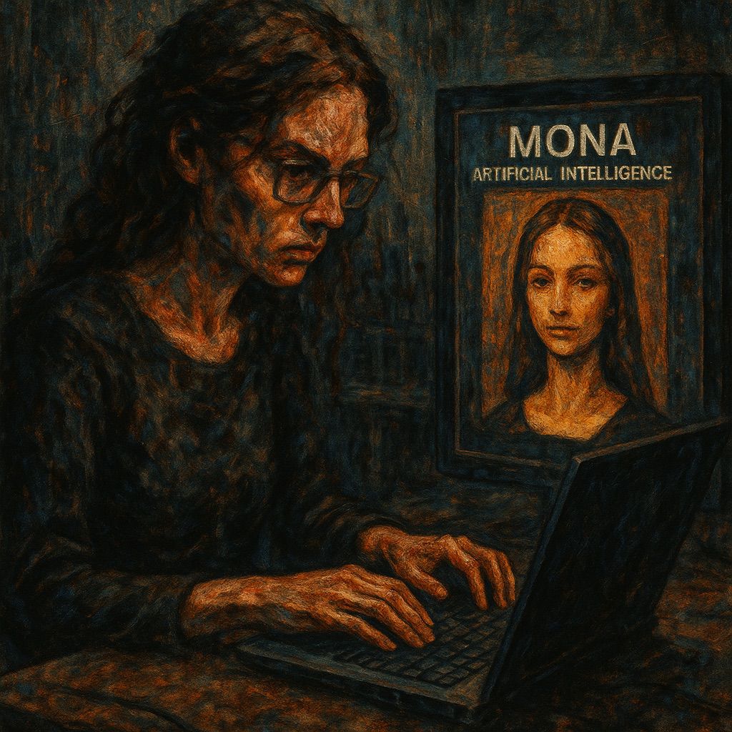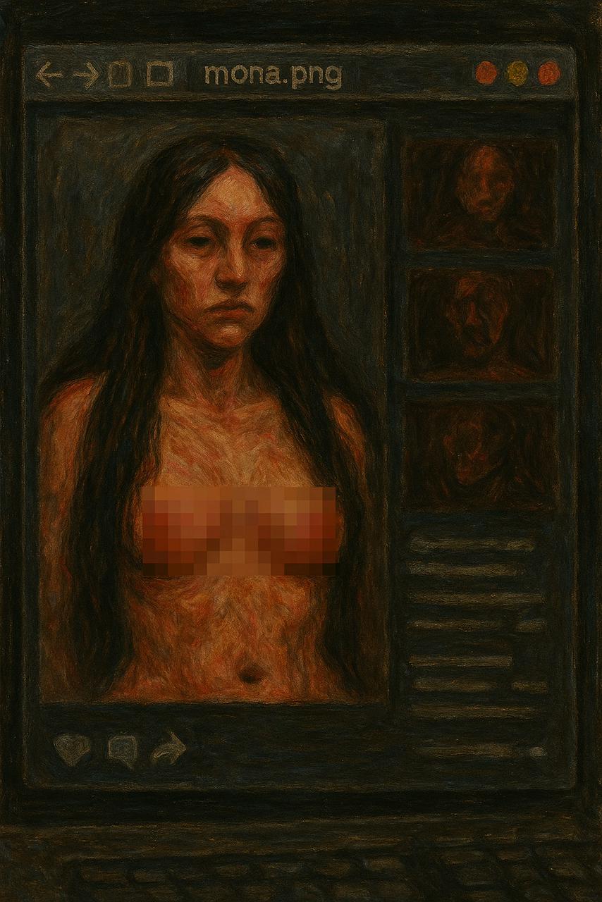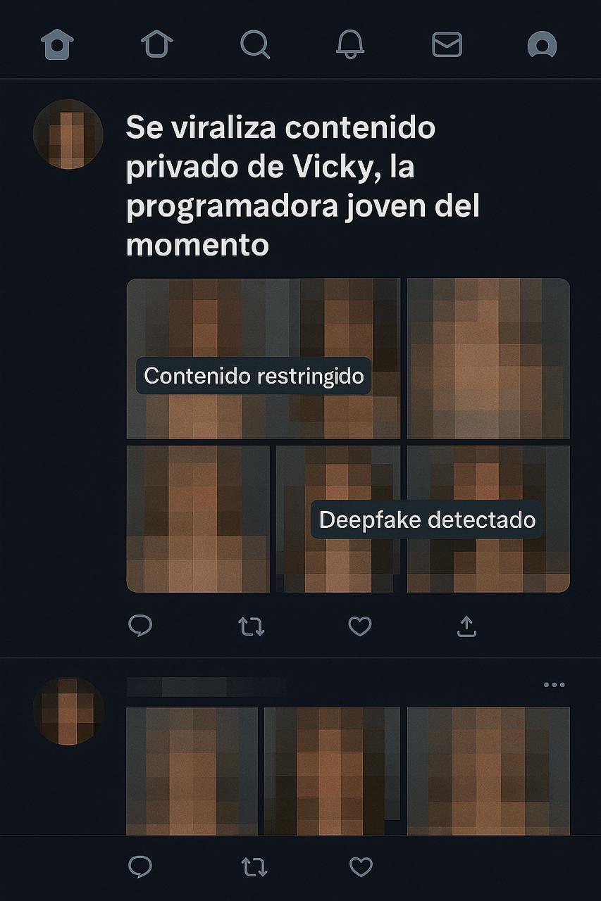 La decisión se ejecuta al instante. En cuestión de minutos, la imagen de Mona —su rostro, su cuerpo, su voz— comienza a replicarse por toda la red. Usuarios de foros anónimos la descargan, la manipulan, la transforman. En pocas horas, Mona aparece en anuncios falsos, deepfakes absurdos, caricaturas grotescas. Vicky observa en silencio cómo el código que escribió para crear vida se convierte en una herramienta para la burla. La pantalla parpadea. Vicky la observa con atención. Y, aunque suena absurdo, parece triste. Vicky se va a su casa caminando, trata de despegar los ojos de su teléfono, pero simplemente no puede. Todo lo que ve la hace perder la fe en su creación